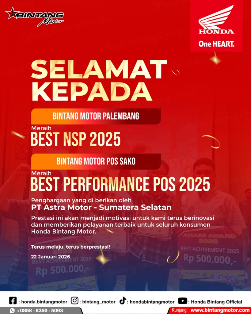 Acara ini tidak hanya menjadi ajang evaluasi kinerja sepanjang tahun sebelumnya, tetapi juga sarana apresiasi atas pencapaian terbaik yang telah diraih oleh jaringan AHASS di wilayah Sumatera Selatan. Dengan mengusung semangat One HEART, seluruh peserta diajak untuk terus bergerak maju, berinovasi, dan memberikan pengalaman servis terbaik bagi konsumen Honda.